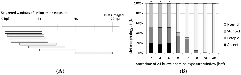 The timing of developmental exposures is important in determining the outcome of the endocrine pancreas morphology. We have previously demonstrated that exposure to the toxin cyclopamine disrupts sonic hedgehog (Shh) signaling and beta cell development in zebrafish embryos, resulting in islet morphologies that deviate from normal spherical clusters, and instead present as either stunted islets comprised of single beta cells, ectopic beta cells that resembled an anterior islet duplication, or absence of beta cells [15]. While exposure to cyclopamine also results in overt embryotoxicity ([15]), the effects on the islet are highly dependent upon the developmental stage at which the exposure occurred. In this experiment, developing embryos were exposed to cyclopamine, a potent inhibitor of Shh signaling, during different critical windows of embryogenesis. These windows were defined as a 24 h period starting and ending at staggered developmental stages starting as early as 2 hpf and as late as 48 hpf (Figure 4a). All embryos were then assessed at 72 hpf for effects on islet morphology. Normal morphologies were obtained when embryos were exposed to cyclopamine at or after 8 hpf (75% epiboly during gastrulation). The addition of cyclopamine during or before shield stage (6 hpf) completely abrogated normal beta cell development, as there were no normal beta cell clusters formed in the embryos treated before this time (Figure 4). These results demonstrate the importance of critical windows of islet development.