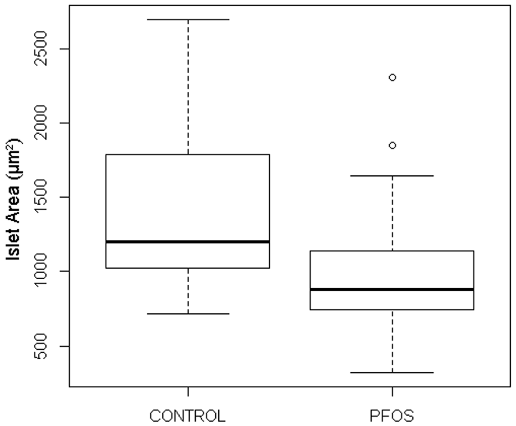 Embryonic Perfluorooctanesulfonic (PFOS) exposure decreases islet area. Subchronic PFOS treatment beginning at 3 hpf decreases islet area in 48 hpf embryos. PFOS-treated embryos (n = 39) were 26% smaller in area than control (n = 37) embryos (p = 0.001). Variability of control islet sizes Interquartile ranges (IQRs) was nearly double that of PFOS-treated embryos, though the IQR of these controls is similar to 48 hpf controls shown in Figure 2.