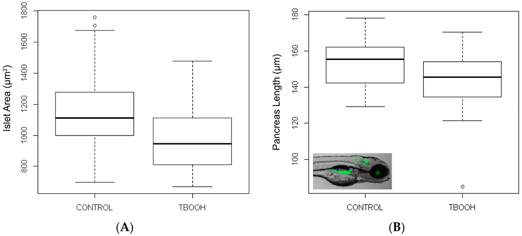 Treatment with the pro-oxidant Tert butylhydroperoxide (tBOOH) beginning at 72 hpf decreases islet area and pancreas length. Eleutheroembryos exposed to tBOOH manifested a significant decrease in islet areas and length of exocrine pancreas, measured at 96 and 80 hpf, respectively. (A) Median islet area for tBOOH treated embryos was 15% lower than that of water controls (p = 0.021); (B) tBOOH treatment at 72 hpf produced significantly shorter pancreata. Median pancreas lengths for tBOOH treated embryos was 6% shorter than controls (p = 0.038).