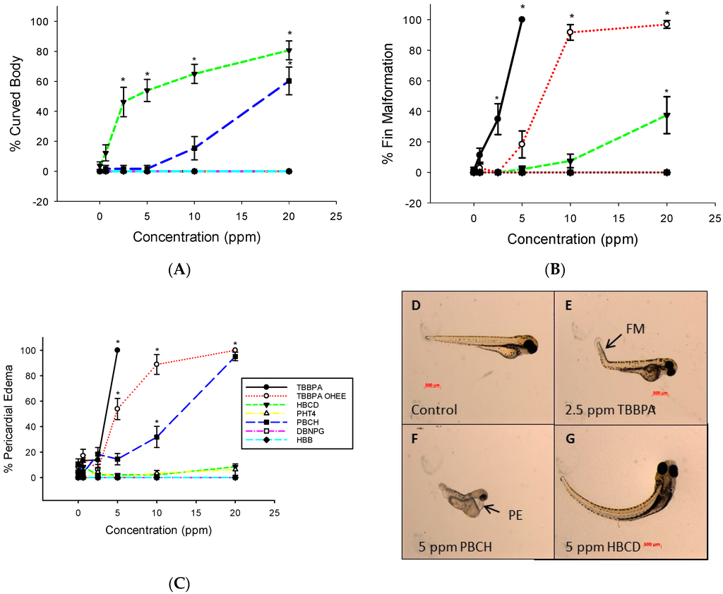 Malformations induced by BFR exposure as observed daily until 168 hpf. (A) HBCD and HBB induced curved body malformations; (B) Fin malformations were also observed in TBBPA and TBBPA-OHEE exposed embryos; (C) TBBPA, TBBPA-OHEE, and PBCH induced pericardial edema. Representative images of 120 hpf larvae from studies shown in panels A–C; (D) control, normal morphology (E) 2.5 ppm TBBPA, FM = fin malformation; (F) 5 ppm PBCH, PE = pericardial edema; and (G) 5 ppm HBCD, curved body malformation.