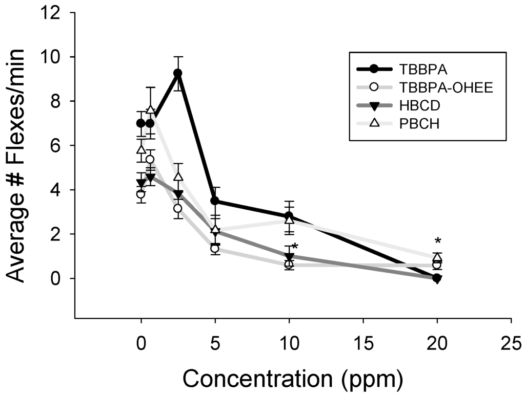 Alterations of spontaneous movement behavior at 24 hpf. Exposure to TBBPA, TBBPA-OHEE, HBCD, and PBCH decreased rates of spontaneous movement in a concentration-dependent manner. Significance is noted by * p < 0.05, N = 12. Data for chemicals that did not alter rates of spontaneous movement are not shown.