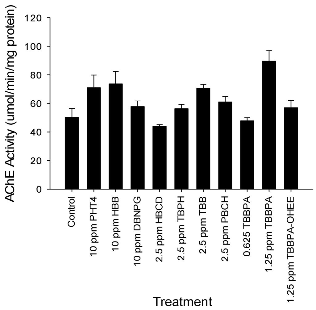 To begin to investigate the mechanistic basis for BFR effects on neuronal function, acetylcholinesterase activity was measured following exposure. Embryos were exposed to each of the nine BFRs at either 10 ppm or the lowest observable effects level in order to ensure chemical-induced mortality did not interfere with results. Acetylcholinesterase activity was not altered following exposure to any of the BFRs tested in this study (Figure 4).