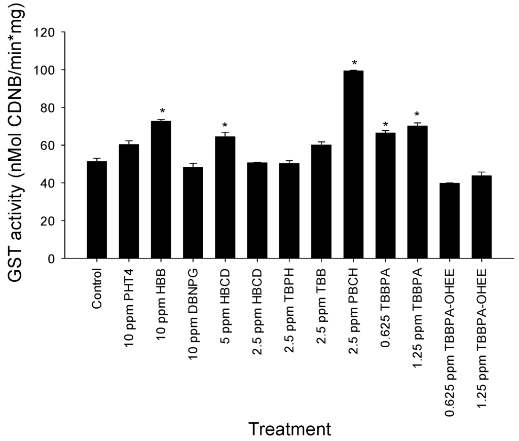 The activity of glutathione-S-transferase (GST) was measured at 120 hpf following exposure. Exposure to TBBPA, HBB, HBCD, and PBCH significantly increased GST activity as compared to the control. * p < 0.05, N = 4.