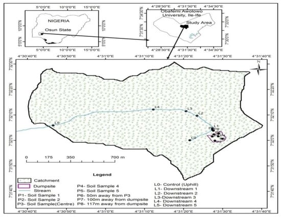 Asunle stream is a recurrent stream that has its source situated about 0.25 km uphill from the refuse dumpsite of the University (Figure 1). The stream runs a distance of more than ten kilometers, and transverses three villages []. Rigorous farming activities take place along the stream course which involve the planting of both cash and food crops, which serve as a source of revenue to the inhabitants of the villages within the catchment of the stream. The rural dwellers who settled close to the course of the stream use the water for household purposes, while farmers within the vicinity of the stream use the stream water for wetting their vegetable nursery beds, palm oil processing, and for dilution and spraying of agrochemicals on the cash crops planted around the area. The full description of the study area has been given by Olutona et al. (2016) [].
