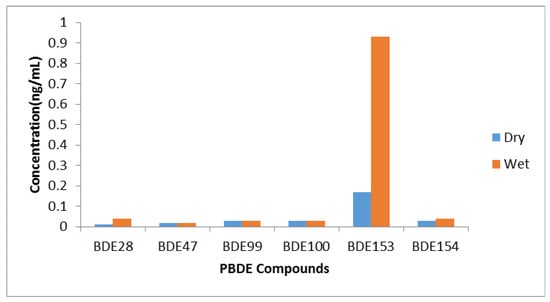 Table 2 presents the monthly variations of PBDEs in the water samples collected from six sampling sites. No data was obtained for December because all the locations investigated in this study were completely dried up during that month. The mean concentration of the Ʃ6PBDEs in the water ranged between 0.03 and 0.45 ng/mL. This result is lower when compared to the values recorded by [] for Diep River, Cape Town, South Africa with ranges from 0.84 to 10,900, 4.99 to 12,000, and 2.89 to 569 ng/mL, while values for the upstream, point of discharge, and downstream locations in the Kuils River, South Africa ranged from 0.71 to 18,500, 22.5 to 176, and 23.6 to 403 ng/mL, respectively.