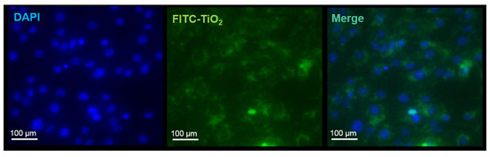 Figure 1. Fluorescence imaging of NIH/3T3 cells incubated with 50 µg mL−1 FITC-TiO2 NPs (green) for 4 h and stained with DAPI (blue). Magnification objective 20×.
