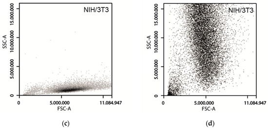 Figure 2. Density Plots of SSC and FSC signals of A549 and NIH/3T3 cells. Cells were incubated with each sample for 24 h. (a) A549 cells with 0 µg mL−1 FITC-TiO2; (b) A549 cells with 25 µg mL−1 FITC-TiO2; (c) NIH/3T3 cells with 0 µg mL−1 FITC-TiO2; (d) NIH/3T3 cells with 25 µg mL−1 FITC-TiO2.