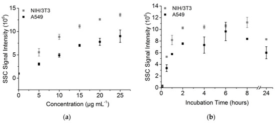 Figure 3. Side scatter signals of A549 and NIH/33 cells. (a) SSC after incubation with different FITC-TiO2 NP concentrations after 24 h incubation; (b) SSC signal kinetic of FITC-TiO2 NPs (12.5 µg mL−1).