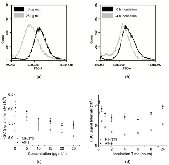 Figure 4. Forward scattering signal of A549 and NIH/3T3 cells. (a) Histogram of FSC signal with 0 µg mL−1 and 25 µg mL−1 FITC-TiO2 and 24 h incubation (NIH/3T3); (b) Histogram of FSC signal after 0 h and 24 h incubation of 12.5 µg mL−1 FITC-TiO2 (NIH/3T3); (c) Forward scatter after incubation with different FITC-TiO2 NPs concentrations (24 h incubation); (d) Uptake kinetic of FITC-TiO2 NPs (12.5 µg mL−1).