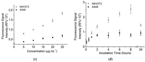 Figure 5. Fluorescence signal of A549 and NIH/3T3 cells. (a) Histogram of fluorescence signal with 0 µg mL−1 and 25 µg mL−1 TiO2 NPs (NIH/3T3); (b) Histogram of fluorescence signal after 0 h and 24 h incubation with 12.5 µg mL−1 FITC-TiO2 NPs (NIH/3T3); (c) Fluorescence signal after incubation with different FITC-TiO2 NP concentrations for 24 h; (d) Uptake kinetic of FITC-TiO2 NPs with 12.5 µg·mL−1, signal has been normalized to control (cells without NPs).