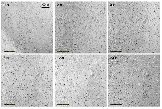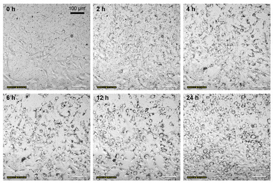 Figure 7. Time-lapse microscopic imaging of NIH/3T3 cells incubated with 12.5 µg mL−1 FITC-TiO2 NPs for 24 h. Magnification 20×.