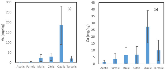 In comparison with As, the rate of Cu mobilization was much higher between 1 and 2%, between 3 and 20%, between 1 and 7%, between 2 and 16%, between 20 and 55%, and between 3 and 25% of the total Cu being released from the soils in the acetic, citric, formic, malic, oxalic, and tartaric acid treatments, respectively (Figure 3).