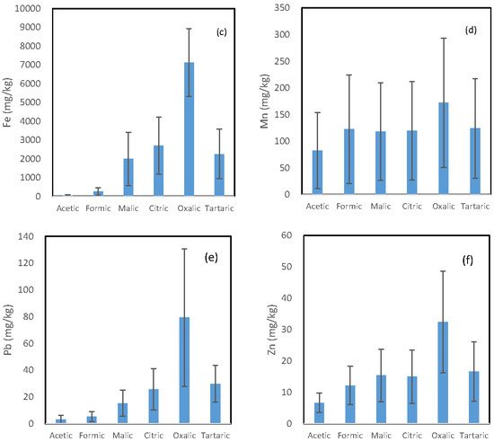 Mean concentration of (a) arsenic; (b) copper; (c) iron; (d) manganese; (e) lead; and (f) zinc being released from the soils by the six organic acids.