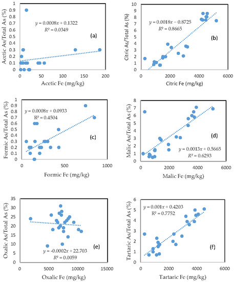 Relationship between the amount of Fe released from the soil and the rate of As mobilization in (a) acetic acid; (b) citric acid; (c) formic acid; (d) malic acid; (e) oxalic acid; and (f) tartaric acid treatments.