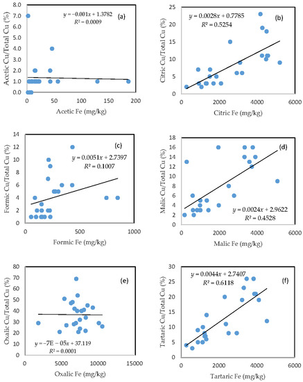 Relationship between the amount of Fe released from the soil and the rate of Cu mobilization in (a) acetic acid; (b) citric acid; (c) formic acid; (d) malic acid; (e) oxalic acid; and (f) tartaric acid treatments.