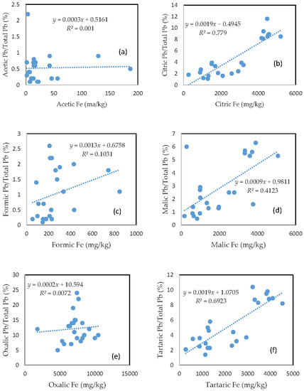 Relationship between the amount of Fe released from the soil and the rate of Pb mobilization in (a) acetic acid; (b) citric acid; (c) formic acid; (d) malic acid; (e) oxalic acid; and (f) tartaric acid treatments.