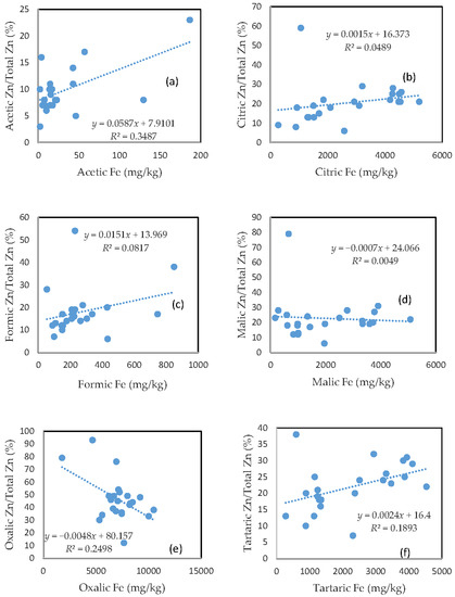 Relationship between the amount of Fe released from the soil and the rate of Zn mobilization in (a) acetic acid; (b) citric acid; (c) formic acid; (d) malic acid; (e) oxalic acid; and (f) tartaric acid treatments.