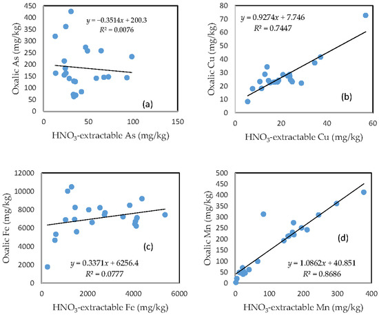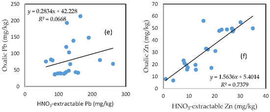 Relationship between the HNO3-extractable fraction and the oxalic acid-extractable fraction for (a) As; (b) Cu; (c) Fe; (d) Mn; (e) Pb; and (f) Zn.