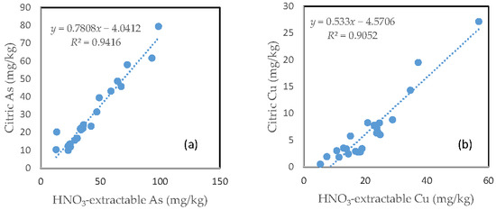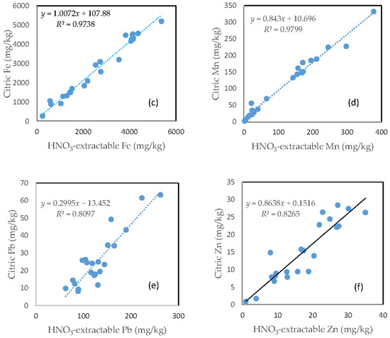 Relationship between the HNO3-extractable fraction and the citric acid-extractable fraction for (a) As; (b) Cu; (c) Fe; (d) Mn; (e) Pb; and (f) Zn.