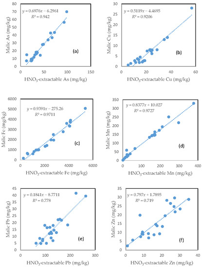 Relationship between the HNO3-extractable fraction and the malic acid-extractable fraction for (a) As; (b) Cu; (c) Fe; (d) Mn; (e) Pb; and (f) Zn.