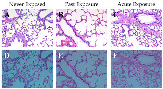 Representative photos of rat lung tissue at 100×; sections show an inflated area that included an arteriole, terminal bronchiole, and a larger bronchiole. (A–C) Hematoxylin and eosin (HE) stained tissue under bright light microscopy, and (D–F) corresponding HE stained tissue under polarized light. (A,D) tissue from a naïve rat that were never exposed to hydrophobic sand (“Never Exposed”); (B,E) tissue from a rat that underwent all LabSand experimental sessions, and was euthanized 1 month after the conclusion of the experiment with no further exposure to hydrophobic sand (“Past Exposure”); (C,F) tissue from a rat that underwent all LabSand experimental but was also placed in a cage with hydrophobic sand for 2 h prior to euthanasia (“Acute Exposure”).