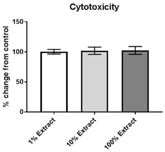 Metabolic viability (MTT assay) was assessed using the CellTiter 96® Aqueous One Solution Cell Proliferation Assay kit (Promega Corporation, Madison, WI, USA). The assay for metabolic viability is based upon the ability of dehydrogenase enzyme systems, located in the cell mitochondria, to reduce a tetrazolium compound to a colored formazan product, which is easily detected colorimetrically. Briefly, one hour prior to the termination of the 24 h treatment incubation period, 10 µL of CellTiter 96® Aqueous One Solution Reagent was added to each well of the plate and the plate returned to the incubator for 1 h. After this time, the absorbance was determined at 490 nm using a microplate reader (SpectraMax Model 250 Microplate Spectrophotometer, Molecular Devices Corporation, Sunnyvale, CA, USA). Metabolic viability of the extract-treated cells was normalized to the media-only control cells.