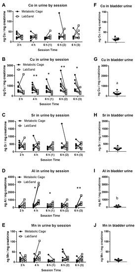 Metal concentrations in urine comparing metabolic cage and LabSand collection methods (A–E) and urine collected from the bladder (F–J). Graphs (F–J) were kept at the same Y-axis value as the corresponding session graph (i.e., A-F, B-G, C-H, D-I, E-J) because bladder urine metal concentrations are directly compared to the 6 h-3 session. Asterisks indicate significant differences in urine metal concentration between collection methods for that session (* p < 0.05, ** p < 0.01), (a) denotes a significant difference in metal concentration between bladder urine and metabolic cage urine from session 6 h-3, and (b) denotes a significant difference in metal concentration between bladder urine and LabSand urine from session 6 h-3.