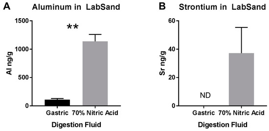 Digestion of LabSand brand hydrophobic sand in either synthetic gastric fluid or 70% nitric acid. (A) Aluminum and (B) Strontium extracted from LabSand under the two digestive conditions. ** p < 0.01, ND = not detected.