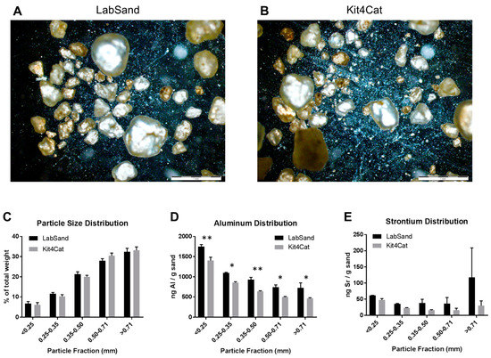 Distribution of particles in hydrophobic sand brands. Brightfield images under 2× magnification for (A) LabSand and (B) Kit4Cat sand samples; (C) Particle size distribution across 5 size fractions for both brands of hydrophobic sand; (D) Aluminum distribution across size fractions for both brands; (E) Strontium distribution across size fractions for both brands. * p < 0.05, ** p < 0.01.