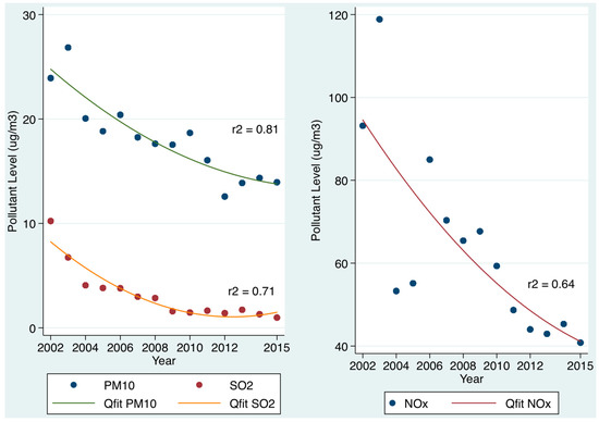 Annual trends of air pollution (PM10, NOx, and SO2) over time from 2002 to 2015. For all three pollutants, there annual average levels have declined over time. The trend lines are nonlinear quadratic fits.
