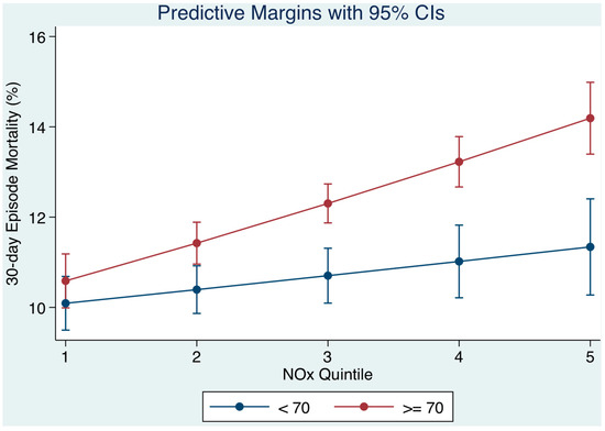 We calculated the average marginal effect (AME) of the patient’s age, when examining the effect of the level of air pollution on the day of admission and the 30-day mortality outcome. The marginal effect estimates the relationship between unit change in the air pollution at time of presentation and the 30-day mortality outcome—all other variables being held constant. The marginal effect is first calculated for each individual at the observed levels of covariates; these values are then averaged across all individuals to yield the average marginal effect (AME). We divided patients into a younger <70 years and older cohort (≥70 years). As NOx quintiles increased (level of NOx on day of admission), the 30-day mortality progressively increased but was higher for older persons. The model prediction for younger patients, 30-day mortality from Q1 to Q5 of NOx would increase from 10.1% to 11.3% contrasting with older patients whose mortality would increase from 10.6% to 14.2% (Figure 2). The interaction effect between NOx quintile and age (< or ≥70 years) was 1.07 (95% CI: 1.04, 1.10).