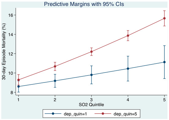 The 30-day in hospital mortality related daily sulphur dioxide (SO2) levels by quintiles to the 30-day in-hospital mortality and adjusted for socio-economic status (SES) and other outcome predictors. We used margins to estimate the average marginal effect. As SO2 quintiles increased (the level of SO2 on day of admission), the 30-day mortality progressively increased, but was higher for patients of lower SES.