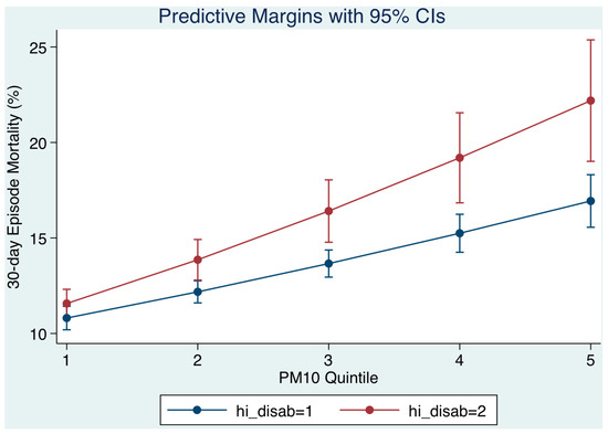 The 30-day in hospital mortality related daily particulate matter (PM10) levels by quintiles to the 30-day in-hospital mortality and adjusted for chronic disabling disease and other outcome predictors. Disabling disease was classified with scores of 1, 2, 3, and 4+ based on the number of organ systems involved; the cut point between less or more was >3. At higher PM10 mass concentration quintiles (level of PM10 on day of admission), the 30-day mortality progressively increased but was higher for patient with more disabling disease.