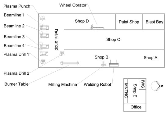 The structural steel fabrication shop employs around 250 full-time workers, including approximately 30 welders and welding apprentices, as well as a similar number of fitters and fitting apprentices. The site contains the following equipment for cutting, machining, and welding: computerized numerical control/personal control (CNC/PC) machinery, including one oxyacetylene/plasma (burner) table; one robotic welding machine; three plasma cutting tables; and four beamlines. Other industrial equipment of interest includes a wheel obrator and milling machine. Production occurs in two buildings, with the shop E building housing shop E, as well as maintenance and ironworker shops. The majority of production occurs in the main building, which houses shop B/A, C, D, detail, paint, and a segregated sandblasting bay. There is limited segregation between the operations: shops B/A, C, and D have partial walls with shipping doors, while at the south end of the main building, the detail shop runs east–west without segregation, with the other shops oriented perpendicularly to it (Figure 1). The facility relies on general (dilution) ventilation, and the personal protective equipment (PPE) policy mandates that welders wear respirators. When the weather is mild, doors are opened to facilitate air renewal inside the facility. All of the field work for this study was performed between January and April 2015.