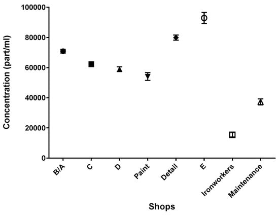 A Kruskal–Wallis multiple comparison showed that the particle counts between all shops were significantly different (p < 0.001), except for shop D and the paint shop (p = 0.0886). The detail shop and shop E showed the highest background particle counts, with geometric means (GMs) of 79,900 and 92,900 part/mL, respectively. The ironworker and maintenance shops showed the lowest background particle count, with GMs of 15,400 and 37,200 part/mL, respectively.