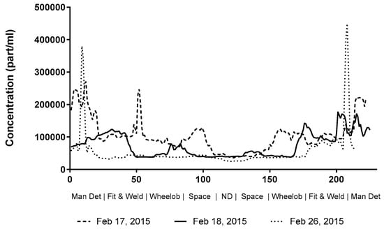 Sampling was performed using the P-Trak (TSI, Shoreview, MN, USA) in “log” mode with the particle concentration recorded every second. Shop area sampling was performed as surveys to evaluate variations in particle levels in the shops, with each survey logging approximately 300 points. These surveys should be considered as background, or area, concentrations in each specific shop. The shop surveys were created by walking a pre-set path determined by landmarks in each shop to visualize any pattern of particle concentration in the shops. Since this was an active worksite, differences in survey length within shops were due to changes in walking speed, right of way, and hazard avoidance rather than changes in survey route. The survey was repeated to identify trends and hotspots in particle generation, and results were graphed for visual interpretation (see Section 3.3). The walkthroughs were performed on 17, 18, and 26 (twice) February; 23 March; and 2 and 16 April 2015. Survey sessions followed the same order: shop B/A, shop C, shop D, paint shop, detail shop, shop E, ironworker shop, and maintenance shop.