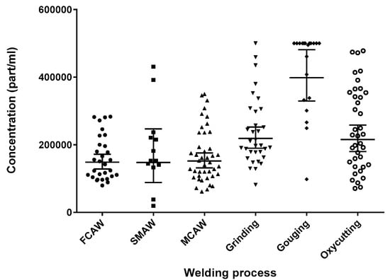 Results for manual task grab samples are shown in Figure 4. Recall that each sample point is the average of the per-second readings taken for the 5 s sample length. Manual task sampling had two notable limitations: taking valid SMAW samples, and instrument limitations biasing gouging results. SMAW is a welding process used exclusively by fitters to tack pieces in place. It was difficult to sample, because tacking often lasted just a few seconds. This meant that arc ignition had to be anticipated in order to get a valid sample, which made these samples less reliable than other samples taken. Gouging generates far more particulates than other processes, and was limited by the upper detection limit (ceiling) that the P-Trak can register of 500,000 part/mL, resulting in an underestimation of the particle concentration produced by this process. With these limitations in mind, a Kruskal–Wallis test determined that FCAW, SMAW, MCAW, grinding, gouging, and oxycutting generated significantly different particle levels (p < 0.0001).