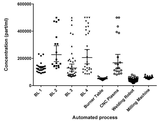 Results for all of the machine operator samples are shown in Figure 5. As for manual tasks, each point represent the average of five readings taken over 5 s. A Kruskal–Wallis test demonstrated that the sources generated significantly different particle levels (p < 0.0001).