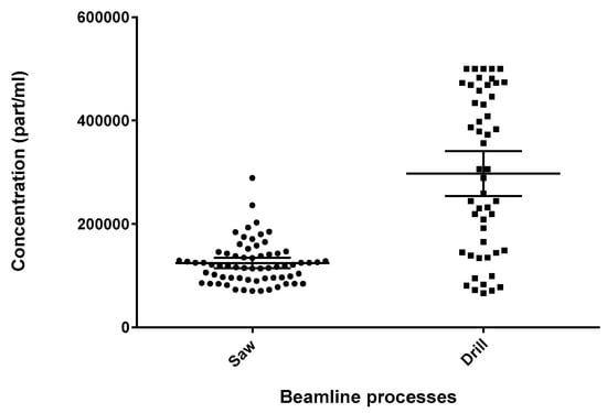 A Kruskal–Wallis test on the four beamlines showed that they too generated significantly different particulate levels (p < 0.0001) with beamlines 1 and 3 (BL 1 and BL 3) being significantly different than beamlines 2 and 4 (BL 2 and BL 4). However, there are two processes on each beamline—sawing and drilling—and using the Mann–Whitney U-test on the pooled values from all beamlines, it seems that drilling produced more particulate than sawing (p < 0.0001) (Figure 6).
