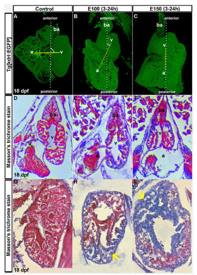 To extend the confocal microscopy data, 18 dpf larvae hearts were sectioned and stained with Masson’s trichrome, which stains muscle fibers red and collagenous fibrous tissue blue []. Low magnification images of the heart sections at the atrioventricular canal (AVC) region showed defective anatomy in atria and ventricles of the ethanol-exposed larvae hearts. Surprisingly, histology sections from a few ethanol-exposed larvae displayed blue coloration in massive trabeculae (irregular muscular columns projecting from the inner surface of the ventricle) areas (Figure 1D–F). Nine control larvae were examined and all trabeculae in control hearts stained intense red indicating healthy cardiac muscle. Four out of nine E100 and four out of eight E150 larvae showed blue coloration in the trabeculae muscle fibers reporting collagenous fibrotic tissues. This result indicated significant cardiac fibrosis in ethanol-exposed larvae possibly due to cardiac damage (Figure 1G–I). Thus, we conclude that exposure to ethanol during early development causes heart deformity and cardiomyopathy in zebrafish.