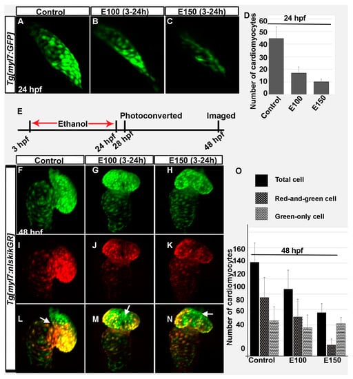 Previous experiments showed that embryos exposed to ethanol from 2 to 48 hpf had smaller, misshapen hearts (occasionally straight heart) when analyzed at 52 hpf []. Ethanol-treated embryos had reduced numbers of ventricular cardiomyocytes []. The treatment period of that experiment (2–48 hpf) comprised all critical heart developmental stages of zebrafish []. In this study, embryos were treated in ethanol from 3 to 24 hpf and analyzed at 48 hpf. This protocol examined a shorter exposure period, ending when the FHF cardiomyocytes organize into a functional heart tube (24 hpf). The hearts in ethanol-exposed embryos were smaller compared to control embryos. Confocal imaging and cell counting of Tg(myl7:GFP) embryos showed significantly reduced number of cardiomyocytes in the linear heart of ethanol-exposed embryos at 24 hpf (Figure 2A–D). Control embryos had 44.43 ± 9.36 cells, whereas, E100 had 16.78 ± 4.87 (p < 0.001), and E150 had 9.8 ± 2.14 cells (p < 0.01). Next, the effects of ethanol on early and late incorporated cardiomyocytes in the heart were examined using Tg(myl7:nlsKikGR) embryos, which labels cardiomyocytes with a green-to-red photoconvertible protein KikGR. Tg(myl7:nlsKikGR) green-to-red photoconvertible protein KikGR fluoresces green before activation by a brief exposure to UV light, which photoconverts KikGR to a red fluorophore. Tg(myl7:nlsKikGR) embryos were photoconverted at 28 hpf and imaged at 48 hpf. The cardiomyocytes imaged at 48 hpf that were photocoverted at 28 hpf (primarily FHF origin) showed both red and green, but the cardiomyocytes incorporated after photoconversion (SHF and cardiac neural crest origin) showed only green fluorescence. Counting of red-and-green and green-only cardiomyocytes showed reduction of both types of cells in E100 embryos compared to control (Control: red-and-green, 75.6 ± 26.3 and green-only, 45.6 ± 17.8; E100: red-and-green, 50.5 ± 22.7 and green-only, 36.1 ± 16.9). E150 embryos had significantly reduced red-and-green cells (14.5 ± 7.8) than green-only cells (41.8 ± 7.9) (Figure 2F–O). Total numbers of cardiomyocytes were significantly reduced after ethanol exposure (Control: 121.1 ± 24.7; E100: 86.62 ± 26.3; E150: 56.3 ± 17.83; control vs. E100, p < 0.05; control vs. E150, p < 0.01) (Figure 2O). Moreover, cardiomyocytes added later (green-only) in the control embryos were mostly distributed in the ventricle near the outflow track and at the base of the ventricle (Figure 2F–L). However, ethanol-treated embryos often had late-added cardiomyocytes in the mid-region of the ventricular wall (Figure 2G–N). Taken together, ethanol exposure reduces both early- and late-added cardiomyocytes and may change the distribution of late-added cardiomyocytes.