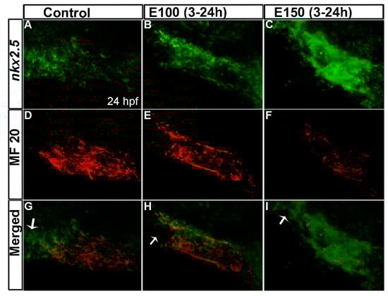 Control embryos showed strong expression of nkx2.5 at the outflow pole that was devoid of MF 20 staining (Figure 3G). SHF progenitors reach the outflow pole region of heart tube at 24 hpf and start to express nkx2.5 []. This was observed in our control embryos (Figure 3A,D,G), but E100 embryos displayed no nkx2.5 expression at the outflow pole (Figure 3B,E,H), possibly because of the delay in SHF progenitor’s arrival. E150 showed strong nkx2.5 expression in all parts of the heat tube, including the anterior part of the heart tube (Figure 3C). This may be due to labeling of undifferentiated FHF progenitors that were still migrating to form the heart tube.