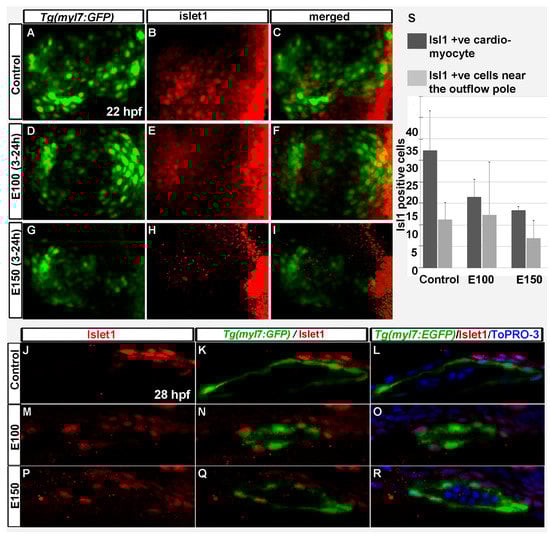 Islet-1 is a critical regulator of SHF development, and SHF progenitors express Islet-1 [,]. To test how ethanol exposure affected SHF progenitors, antibody staining was performed in Tg(myl7:GFP) embryos to label Islet-1 at 22 and 26 hpf. Confocal imaging was done, and Islet-1 expressing cells were counted. Control embryos showed Islet-1 positive cells intermingled with myl7:GFP positive cells in the rotating heart cone at 22 hpf (Figure 4A–C). E100 embryos had fewer Islet-1 positive cells in the heart cone (Figure 4D–F). E150 embryos had no Islet-1 positive cells at 22 hpf in the heart cone (Figure 4G–I). At 26 hpf, Islet-1 positive cells were found in the heart and expressing myl7:GFP. Some Islet-1 cells were located in the outflow pole, close to the ventricle (Figure 4J–R). Similar distributions were observed in the control and ethanol treated embryos (Figure 4J–R). However, the numbers of cardiomyocytes expressing both myl7:GFP and Islet-1 were significantly reduced in ethanol-exposed embryos (Control: 27.4 ± 9.0, E100: 16.5 ± 4.0, E150: 13.5 ± 0.7; Control vs. E100 p < 0.05, Control vs. E150 p < 0.01) (Figure 4S).