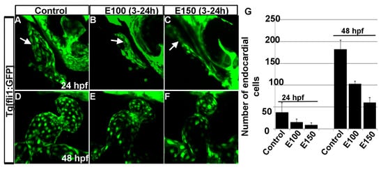 Our previous studies showed that ethanol exposure changed the shape of the endocardium []. To understand the endocardium defects, endocardial cells were counted using Tg(fli1:EGFP) embryos, which labels endothelial and endocardial cells. Counting GFP positive cells in three dimensional Tg(fli1:EGFP) images showed a significant reduction in the numbers of endocardial cells after ethanol exposure (Figure 5A–G). At 24 hpf, control embryos had 44.43 ± 15.72 cells, whereas, E100 had 15.75 ± 6.36 (p < 0.01), and E150 had 9.0 ± 5.1 cells (p < 0.001). At 50 hpf, endocardial cell number increased in the control embryos to 182 ± 20.79. E100 embryos had 103 ± 5.95 (p < 0.05), and E150 had 60 ± 11.2 (p < 0.001) cells at that stage (Figure 5G). This result showed that ethanol affected endocardium development.