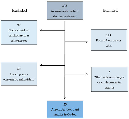 Appropriate hits were analyzed in detail and reference lists were screened for additional appropriate studies. Our initial search returned 308 potential studies to include. One hundred and nineteen studies were eliminated because they were focused on the effects of arsenic on cancer cells, 99 focused on non-cardiovascular cell or tissue types (10 blood, 37 liver/kidney, 16 brain and nervous system, 8 reproductive system, and 28 other), 60 did not investigate the restorative effects of a non-enzymatic antioxidant, 3 had an environmental focus, and 2 were epidemiological studies (Figure 1). The remaining 25 articles were included in the present review. We assessed the quality of the studies analyzed in this review in terms of clarity of purpose, experimental design, appropriateness of statistical methods used, thoroughness of data reporting, and impact of primary research article and journal in which the article was published. No additional studies were collected from Web of Science or Google Scholar. We included animal model investigations and cell culture studies in this review. Our search yielded studies investigating isolated heart mitochondria, cardiomyocytes, and cardiovascular tissues.