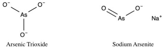 Dose selection justifications varied between studies, but generally, in vivo doses were selected based on the literature [33,52,53,54,55]. For example, as a fraction of the lethal dose [56], or experimentally as the minimum dose that induced cardio-toxic effects [57]. In vitro arsenic doses were selected based on significant detrimental effects on cell viability and/or cell death and were further stratified by exposure duration (Table 1). The studies presented in this review utilized arsenic trioxide (As2O3) [32,45,53,54,57,58,59,60,61,62,63,64,65,66] or sodium arsenite (NaAsO2) (Figure 2) [49,55,56,67,68,69,70,71] at in vivo doses ranging from 0.8 mg/kg/day to 5 mg/kg/day administered intravenously or 2 mg/kg/day to 50 mg/kg/day administered orally for durations of 6 to 56 days. Experimental animals included Sprague Dawley rats [49,55,70], Wistar rats [59,67], BABL/c mice [72], APO E-/- mice [71], and guinea pigs [58]. In vitro exposures ranged from 1 μM to 20 μM arsenic at exposure durations of <3 to 72 h. Cell types included neonatal ventricular cardiomyocytes (NRLVM) [64], rat embryonic cardiomyocytes (H9c2) [62], primary cardiomyocytes isolated from Albino Wistar rats [69], and primary guinea pig cardiomyocytes [58]. Although not the focus of the present review, one study also utilized human promyelotic leukemia (NB4) cells [65].