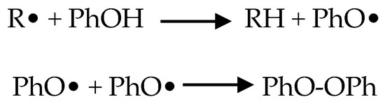 The studies selected for this review analyzed the abilities of antioxidants to counteract the toxic effects of arsenic on mitochondria in cardiovascular tissues and cells. It is worth noting that the majority of these antioxidants were phenolic compounds. Polyphenolic compounds belong to a heterogeneous group of chemicals that contain one or more aromatic rings and one or more hydroxyl groups. Polyphenols have non-enzymatic antioxidant activities that scavenge free radicals and oxidants such as O−, ONOO− and H2O2. Oxidants are deactivated by polyphenolic antioxidant (POH) donation of a hydrogen atom, forming a phenoxy radical (PhO•). Phenoxy radical intermediates may stabilize either through intermolecular bonding between two polyphenols or via reaction with other radicals (Figure 3).