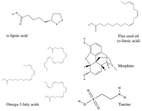 Several studies investigated non-polyphenolic compounds. These included taurine, a sulfonic acid derivative of the amino acid cysteine; omega-3 fatty acid, which is found in fish oil and contains eicosapentaenoic acid (EPA) and docosahexaenoic acid (DHA); flax seed oil, an alpha-linoleic acid; and the organosulfur compound alpha-lipoic acid.