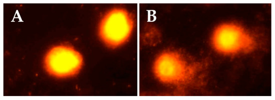 Evaluation of DNA damage by the comet assay in controls (A) and exposed subjects (B). Ethidium bromide-stained comets were visualized by a fluorescent microscope at 400× magnification.