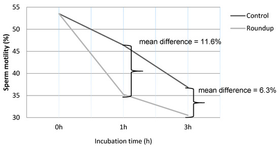 Schematic presentation of the percentage (%) of the progressive motility (PRM) between untreated (control) and the herbicide-(Roundup-) treated sperm samples. After 1 h of exposure to the Roundup, an approximately 11.16% reduction in motility was observed compared to control cells, whereas after 3 h incubation an approximately 6.33% decrease was observed, compared to controls (11.16% vs. 6.33%, p < 0.05).